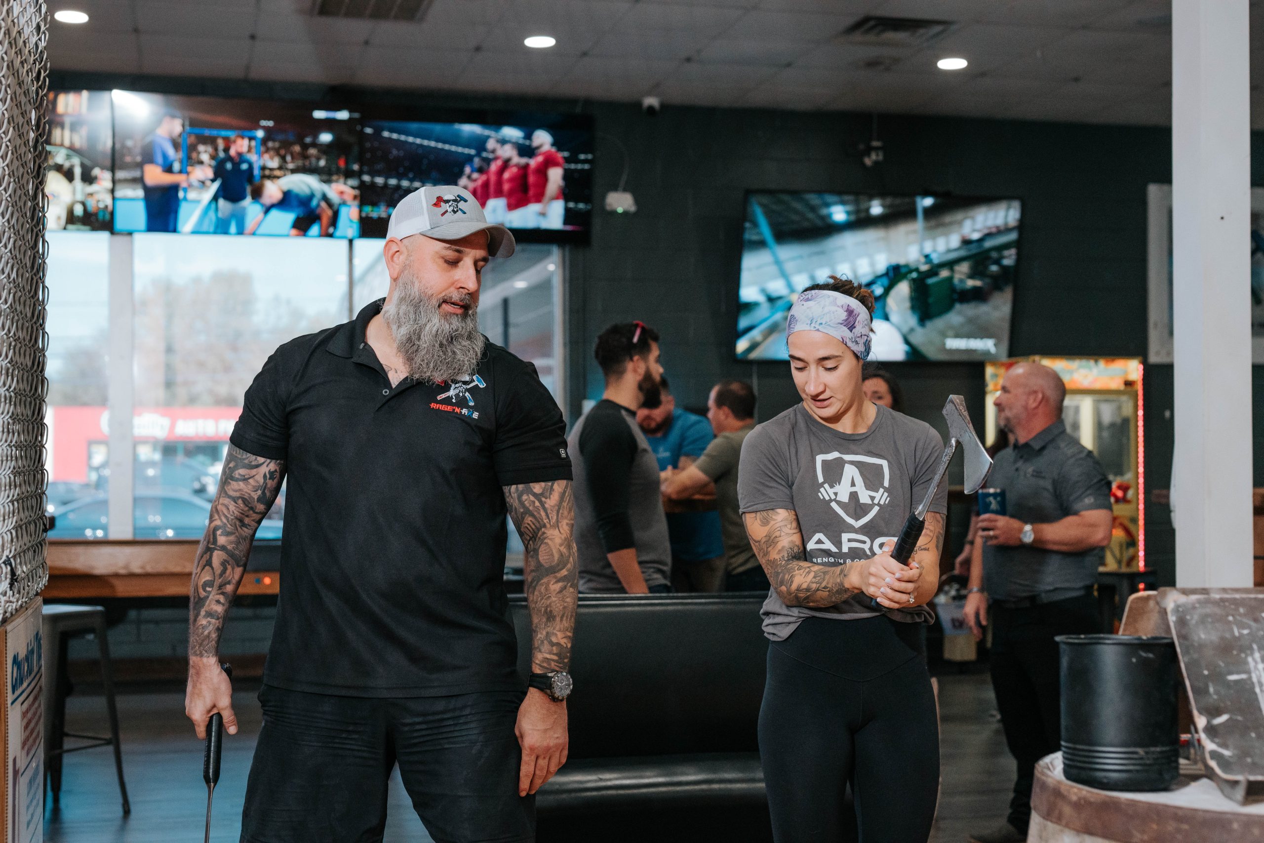 Axe Throwing: What you need to know Ready to unleash your inner warrior? Whether you’re a seasoned thrower or trying it for the first time, our state-of-the-art axe throwing lanes are designed for safe, competitive fun. Here’s everything you need to know before you throw! Book Now Getting Started: Axe Throwing 101 Arrive Early Please arrive 15 minutes before your reservation to check in, sign waivers if you haven’t online, and go through a quick safety briefing. Safety First Our expert staff will guide you through: Proper throwing technique Lane safety rules How to score a game Dress Appropriately Closed-toe shoes are required – no exceptions Comfortable clothing is recommended for easy movement Learn the Basics Use a two-handed or one-handed throwing grip Aim for the bullseye, adjust your stance and stick your shot Coaches will be nearby to help you sharpen your skills! Game Time & Rules Each session lasts a minimum of 60 minutes (extended times available) You can throw solo or compete in games like: Around the World 21 Standard Bullseye Challenge Up to 6 throwers per target at a time Ages 8+ welcome with a parent/guardian present Safety & Supervision All participants must sign a waiver Instructors are always on hand to ensure safety and guide your experience No horseplay or intoxicated behavior is tolerated – safety is our top priority Reservations & Walk-Ins Walk-ins welcome, but reservations are recommended during weekends and events Perfect for: Group outings Date nights Bachelor/bachelorette parties Company team-building events Game Time & Rules Each session lasts a minimum of 60 minutes (extended times available) You can throw solo or compete in games like: Around the World 21 Standard Bullseye Challenge Up to 6 throwers per target at a time Ages 8+ welcome with a parent/guardian present Safety & Supervision All participants must sign a waiver Instructors are always on hand to ensure safety and guide your experience No horseplay or intoxicated behavior is tolerated – safety is our top priority Reservations & Walk-Ins Walk-ins welcome, but reservations are recommended during weekends and events Perfect for: Group outings Date nights Bachelor/bachelorette parties Company team-building events