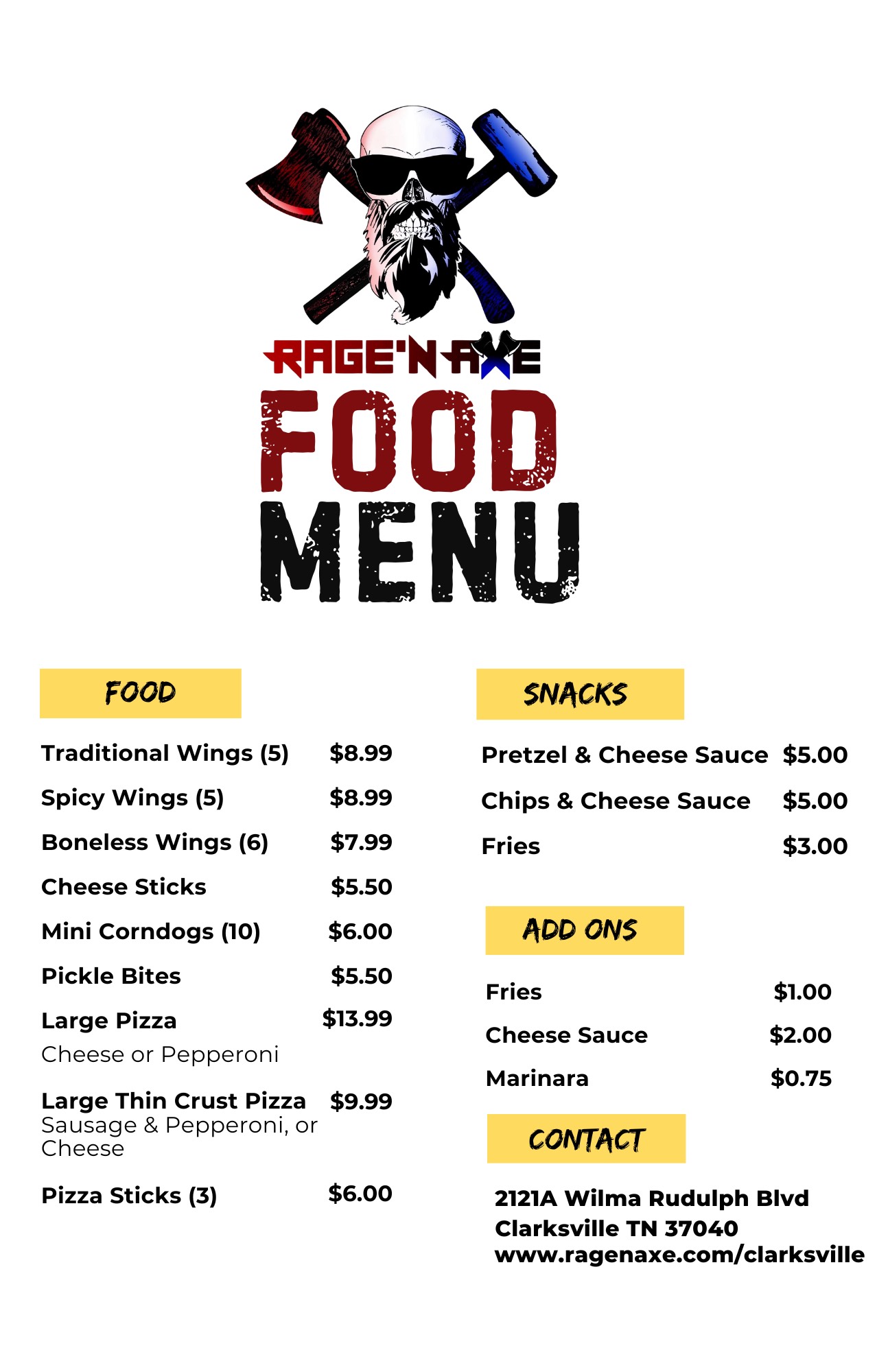 Food Menu Book Now Fuel up before or after the game of your choice. Rage N Axe has a variety of delicious menu items to satisfy everyone. Fuel up before or after the game of your choice. Rage N Axe has a variety of delicious menu items to satisfy everyone.